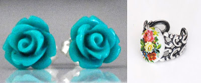 Belle, of down the alley [dta], is giving you a choice between two lovely pieces of jewelry! The winner’s first option is adorable Turquoise Rose Flower Earrings with sturdy sterling silver posts and earnuts. The other option is this beautiful adjustable Bouquet Ring. I love the silver-plated ornate band, it gives it a gorgeous vintage look!