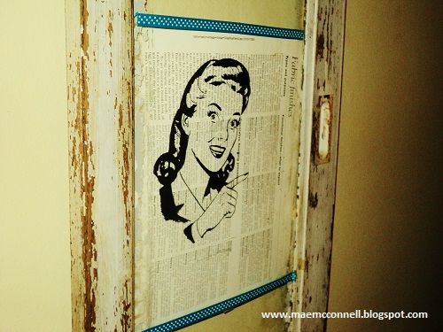 I’m a huge fan of the 1950’s retro style (who isn’t?) and when I saw these images on the Graphics Fairy, I knew I had to use them. Remembering the book art I had pinned above, I quickly tore pages out of an old sewing book and got to printing.