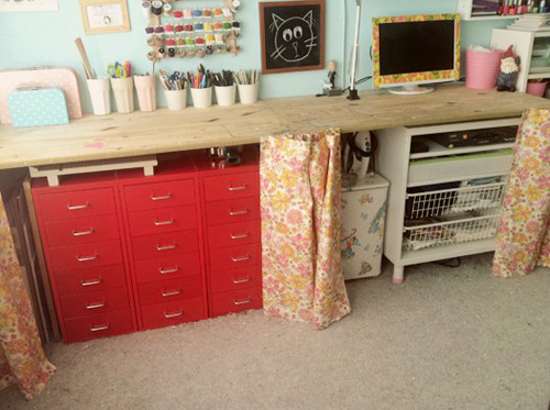 I’ve been getting really inspired by searching Pinterest. While I already had a board for my “Studio Dream“, I created a new board called “Studio Makeover” because let’s face it, my “studio dream” is not going to happen in this tiny 2nd bedroom of our rental house. It’s time to be realistic and come up with solutions based on what space (and money) is available now.
