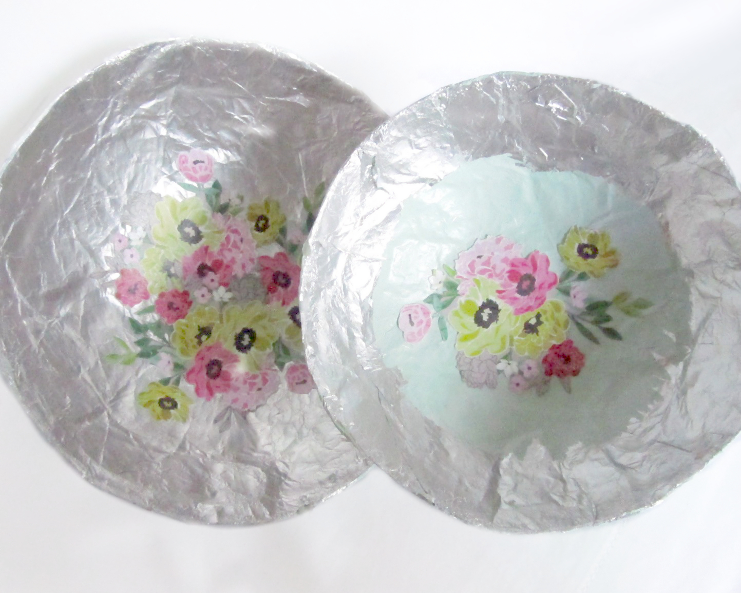Cut your tin foil into small squares. You don’t really want large pieces. It doesn’t quite give you the same effect. I also switched to a spray adhesive to adhere each one to the bowl. The Mod Podge just didn’t here well with the slick surface. Crumple each piece, carefully flatten them out, then decopauge them onto the bowl same as the paper, shiny side down. Once it’s all silvery, take a small, flat-edged object , like a scoring tool, and smooth out all of the foil.