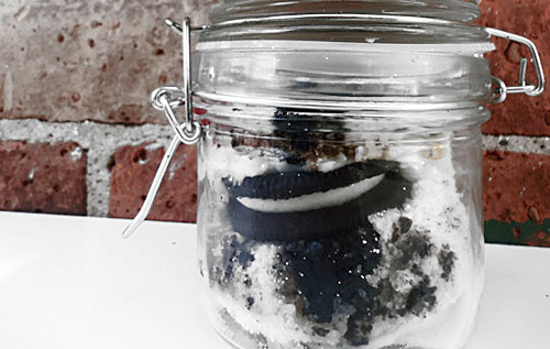 Bake at 350 for about 20-25 minutes. After they cool, cut them in half. Set an oreo on the bottom of the jar. Now pipe frosting on top of the Oreo. I use a large round 1A Tip inside of a Disposable Piping Bag.