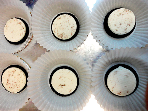 Twist the top part off of 12 Oreos so the white creamy-ness is exposed. Line 12 cupcake wrappers with the exposed Oreo Cookies.