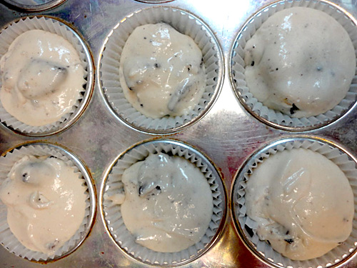 Cut 12 Oreo Cookies into quarters and coat with flour (the flour helps the oreo cookies to float inside of the cupcake instead of falling to the bottom). Use a spatula to mix the oreo cookies into your batter! Use an ice cream scoop to fill your cupcake liners with batter-right over the top of the exposed Oreo Cookies.